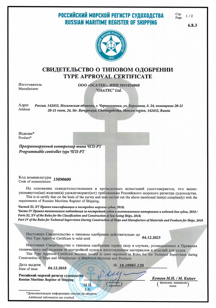 - Одобрен Российским морским регистром судоходства