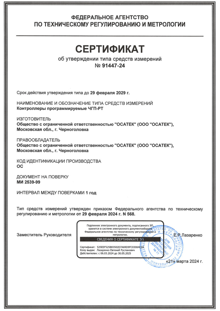 Контроллер ЧГП-РТ разработан и производится в России, одобрен Российским морским регистром судоходства. На контроллер получен Сертификат об утверждении типа средств измерений.